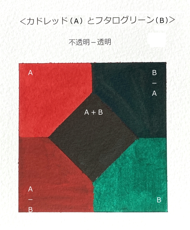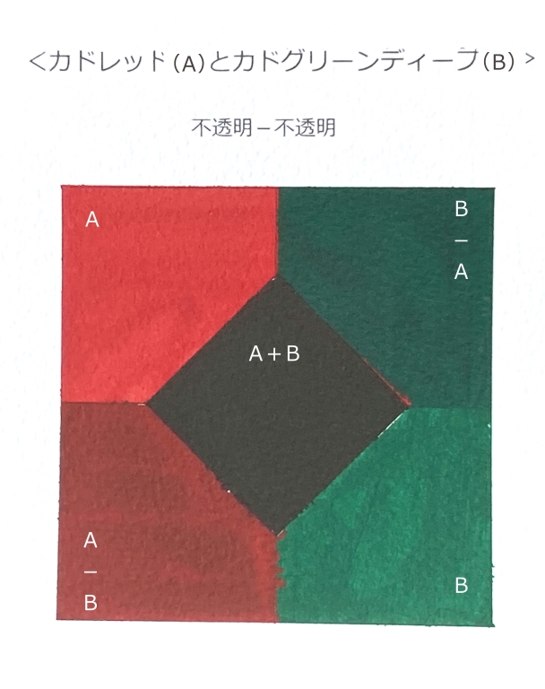 さてここで、①不透明色同士の塗り重ね、②不透明色と透明色の塗り重ね、③透明色同士の塗り重ねについて、どの様になるか示した資料をお目にかけたい。1つめはカドレッド(A)とカドグリーンディープ(B)の不透明色同士を対角に配置し、真ん中にこの2色を混色した場合にできる色を塗った。2色が補色関係にある事から、暗いグレーができる。右上の部分は(A)の上に(B)を塗り重ねたもの、左下は逆に(B)の上に(A)を塗り重ねたものである。不透明色とはいえ、完全に不透明というわけではないので、それぞれ塗り重なった部分は下地の影響を受けて暗くはなっているが、基本、緑は緑、赤は赤という具合に見える。