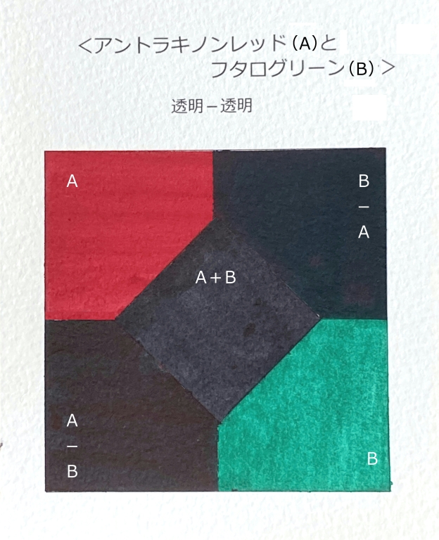3つ目はアントラキノンレッド(A)とフタログリーン(B)という透明色同士の組み合わせである。この場合、一目瞭然だが、右上と左下の透明色同士の重ね合わせはいずれも黒になっていて、混色した真ん中部分よりはるかに暗い。ここでやってみた実験は極めて特殊な試みであるが、より一般的な、例えば青と黄色の塗り重ねとかにも応用がきくだろう。覚えておいて欲しいのは、色同士を混色した場合より塗り重ねた場合の方が暗くなるということ、そしてそれぞれの色が透明色なのか不透明なのかを知って使わなければ、思ったような表現をすることができないということだ。色に慣れていない人は、どうか絵具各社が公表している絵具の透明性に関する資料を参考にしていただきたいと思う。