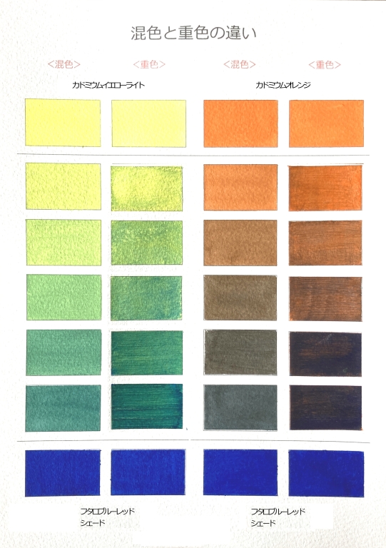 これまで5回に渡って混色の話をしてきた。今回はその続きではあるけれど、混色と重色との違いについて書いてみたいと思ったので、あえて特別編とした。混色と重色の違いで単純にわかる違いは、前者が塗る前から色がわかっているのに対して、後者は塗ってみないとわからないということだろう。色と色を混ぜて別な色を作ると、人は塗る前に色が知覚できている。ところが、塗った色の上に別な色を塗り重ねる場合はどうだろう。塗り重ねてみなければ見え方がわからないので、とりあえず薄い色を何度か塗り重ねて、自分のイメージに近づけるという方法が普通だろう。まずは、アクリル絵具で作成した最初の資料を見てもらいたい。これは不透明色であるカドミウムイエローライトやカドミウムオレンジに対して、透明色であるフタロブルーレッドシェードを混色したり、塗り重ねたりした時の違いについて示したものである。