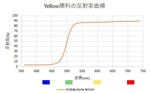 我々が若い頃には絵具の三原色は赤、黄色、青と教わったが、技術の進歩に伴い、それぞれ混ぜ合わせたときに都合の良い位置の顔料が開発され、現在では少しだけ位置のずれたシアン、マゼンタ、イエローが三原色として提唱されるようになった。以下の議論では話を単純化するため、三原色を昔ながらの赤、黄色、青として進めたい。なぜ黄色だけ「色」がつくのかという人もいるだろうが、今回のコラムの本旨ではないので説明を省く。さて、絵具の三原色の一つが緑ではなく黄色なのはなぜか。実は図で見るとおり、黄色という色は赤の波長の光と緑の波長の光を足したものであるため、広い波長領域をもち、そのため明度が高い。光を足すときには加法混色なので、緑と赤を足すことで黄色になるが、顔料で表現するときは減法混色なので、お互いの引き算となって、黄色を表現することができないのだ。絵具で緑と赤を混ぜると暗いグレーができてしまうことになる。従って、絵具の三原色には黄色が欠かせない。後で述べるが、この黄色のもつ反射率が実は多くの人の混色の勘違いに関係している。