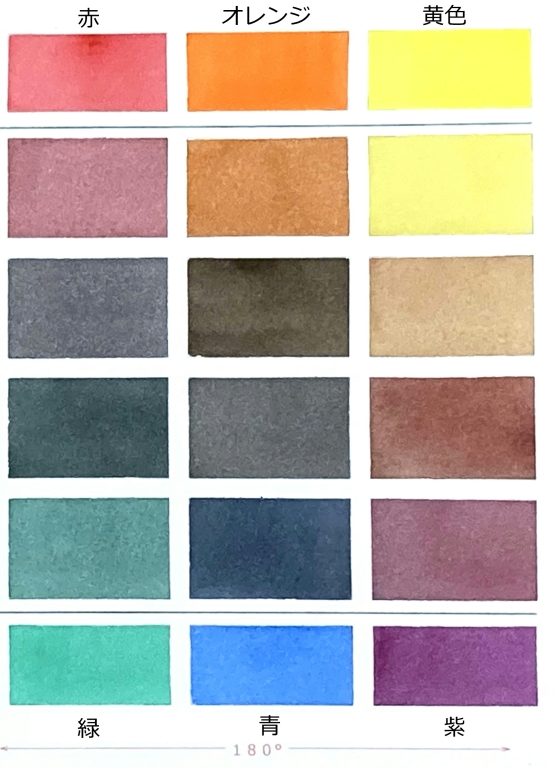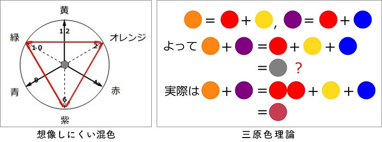 自分自身が若い頃に習った三原色理論では、次のように教わった。オレンジは赤と黄色の混ざったものであり、紫は青と赤の混ざったものである。従って、この2色を混ぜた場合、赤と青と黄色の三原色混色となり、グレーになる。こう信じている人も多いだろう。ところが実際にはそうならない。