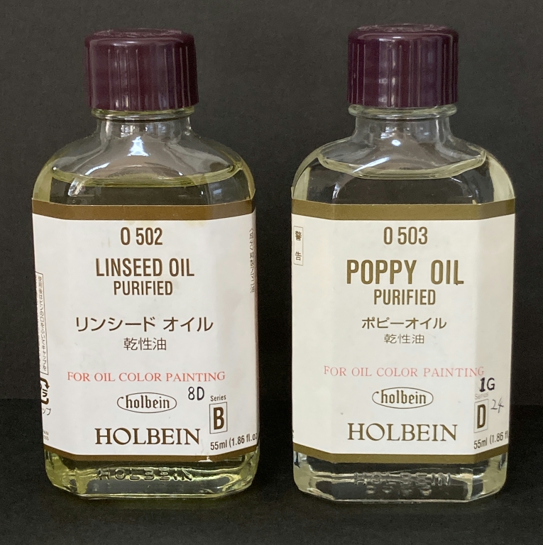 現在、我々が入手できる油にはどんなものがあるだろうか。是非とも皆さんも「サラダ油」の容器のラベルに書かれている原料に注目して頂きたい。大豆油、オリーブ油、コーン油、菜種油(キャノーラ)、綿実油、ひまわり油(サンフラワー)、紅花油(サフラワー)、ごま油、米油、椿油、などたくさんの種類がある。言われてみると「本当だ。そんな油があったな。」と思われることだろう。それ以外にも最近では健康食品としてω-3タイプの油として、アマニ油やエゴマ油なんてのが売られていたり、宣伝されていたりするのを耳にされる事だろう。ではすべての植物油が油絵具に使えるのかと言えば、そんなはずはなく、特定の性質をもった油だけが使えるのだ。それは何かと言えば、空気に触れると勝手に乾くという性質であり、こういう性質をもった油の事を乾性油と称している。乾性油は基本的に常温で数日、空気にさらすと固まってしまう。これに対して、ゆっくりゆっくり長時間をかけて固まっていく油を半乾性油といい、いくら待っても乾かない油を不乾性油という。冒頭で示したアマニ油やケシ油は典型的な乾性油である。実は他にも乾性油はあって、もちろん油絵具に使用可能だが、なぜ特定の油が主に使われるようになったかと言えば、それは経済原則に基づき、手に入りやすく安価であったからというのが実情だろう。